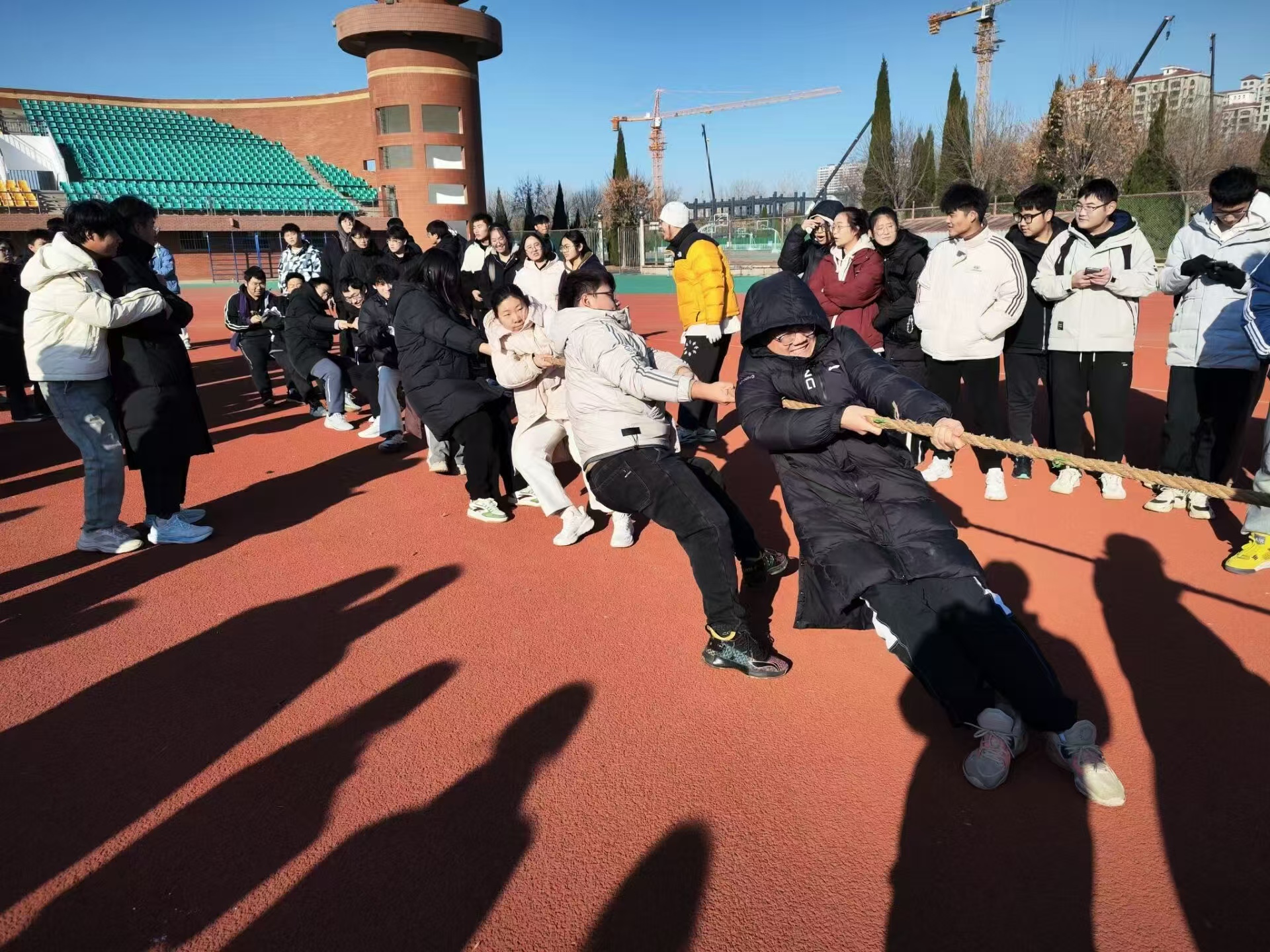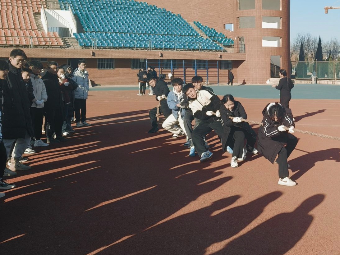 当粗绳绷紧,力量在两端汇聚,一场激烈的拔河比赛正式拉开帷幕。尽管冬风凛冽,但拔河赛场上的火热氛围却丝毫未减。本次拔河比赛共设两轮,采用淘汰赛制,每轮比赛三局两胜。每单次拔河结束后,双方队伍还会易边再战,确保比赛的公平性和趣味性。随着活动负责人的一声令下,比赛正式开始。双方同学们咬紧牙关,紧握长绳,全力以赴地为自己的班级争取胜利。参赛同学们紧绷的肌肉和挥洒的汗水无不洋溢着青春的气息,而场外的同学们则为他们加油助威,热情洋溢,整个赛场充满了团结和奋斗的氛围。