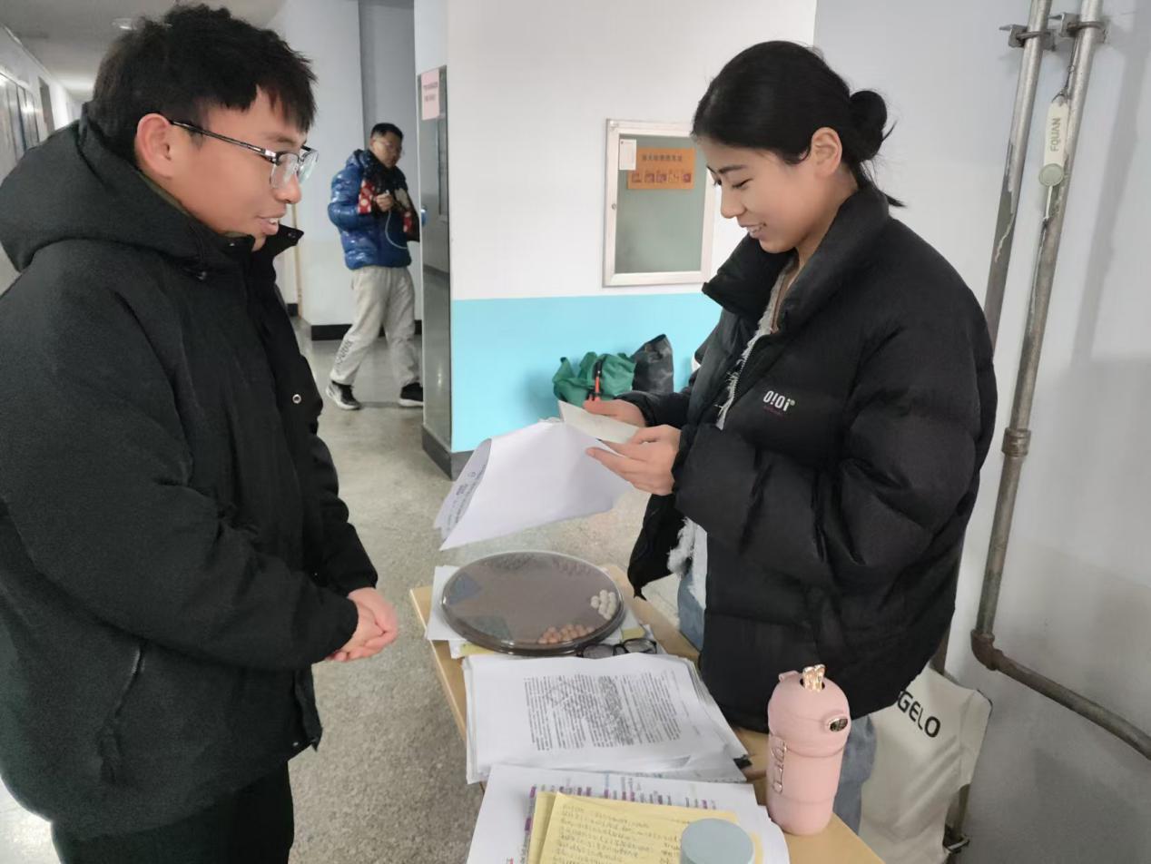 学生们组成流动小组,在教学楼旁寻找正在备考的考研学生,亲手将这些温暖的礼物送到他们手中,并送上真挚的祝福和鼓励。备战考研的学生们对这份突如其来的温暖礼物感到惊喜,这些真挚的话语如同冬日里的暖阳,慰藉了他们疲惫的心灵,激励他们在考研的道路上更加努力,勇敢追逐梦想。