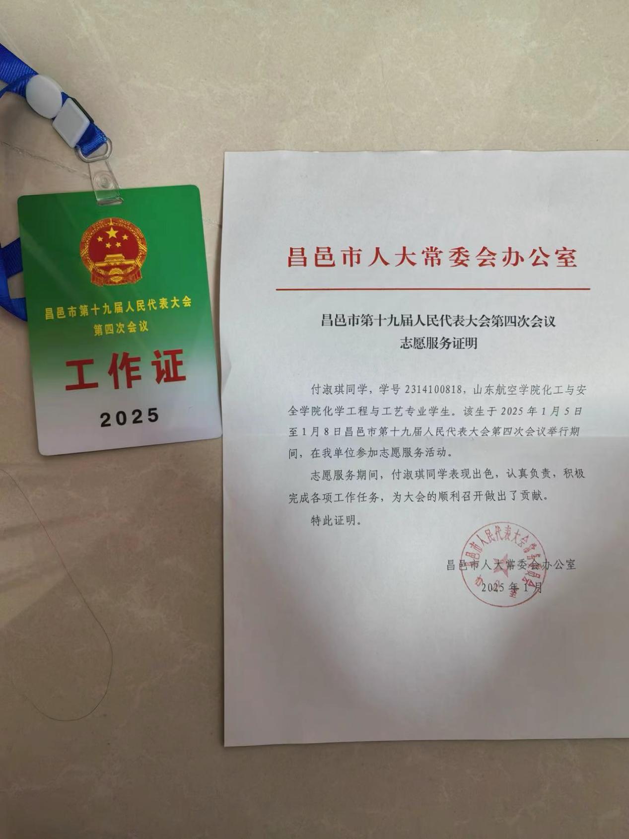 23级化工本2班的付淑琪同学在昌邑市第十九届人民代表大会第四次会议期间,以志愿者的身份展现了艾弗森贝博ballbet官网学子的风采。从资料整理到代表引导,她用细致与热情保障了会议的高效有序。
