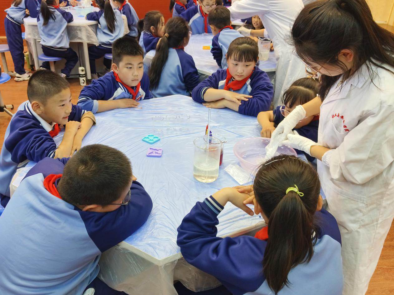 接下来,小陈老师和指导老师们带领同学们进入了水宝宝的制作环节。同学们亲手将海藻酸钠、氯化钙和食用色素混合,然后将盛有海藻酸钠的模具浸入氯化钙溶液中。不一会,一个个可爱的水宝宝便诞生了。