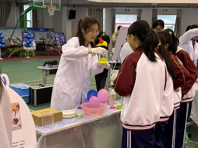 活动现场,“学海领航”团队精心设计“奇妙的化学世界”主题展区,将总书记提出的“科技创新与科学普及两翼齐飞”理念转化为生动实践。在“水宝宝扎染”实验区,学生们通过海藻酸钠与乳酸钙的离子反应,感受物质变化的奇妙;“熔岩灯”实验中,液体翻滚如岩浆涌动,直观展现密度与对流原理;神秘的“鲁米诺试验”在黑暗中绽放蓝光,激发对刑侦科学的探索热情。同学们分组协作、记录数据、踊跃提问,在实践中锤炼科学思维,培养了严谨求实、追求真理的科研品格。