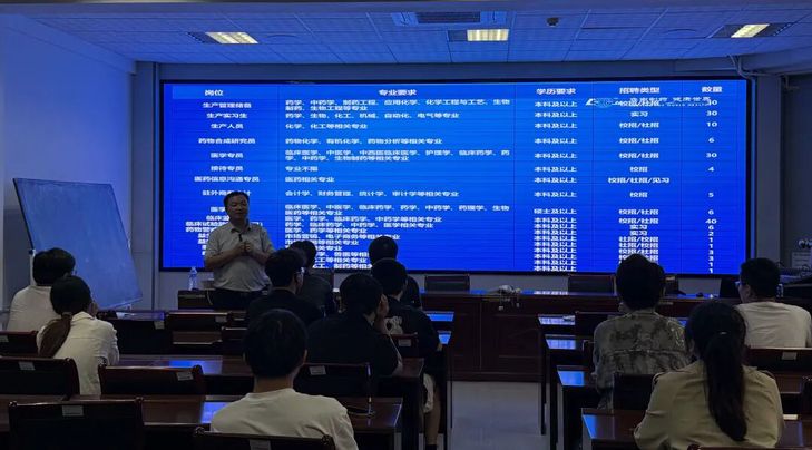 招聘会上,负责人首先介绍了鲁南制药集团的发展概况:作为集生产、科研、销售于一体的综合制药集团,其位列中国制造业500强,2024年品牌价值达130.69亿元,展现了强劲的行业实力与发展潜力。结合学院专业特色,负责人重点解读了药物合成研究员、原料药进口等适配岗位的需求,同时详细说明“七险一金”、人才补贴、带薪假期等福利待遇。